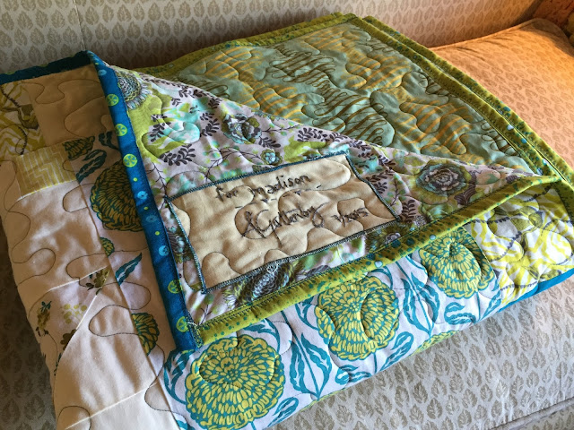 i made this quilt my own sampler, just sewing blocks and putting them together using a color palette i loved. i also used large pieces of fabric for space-fillers. i embroidered madison's name pretty large on the front. i like combining embroidery with quilting.